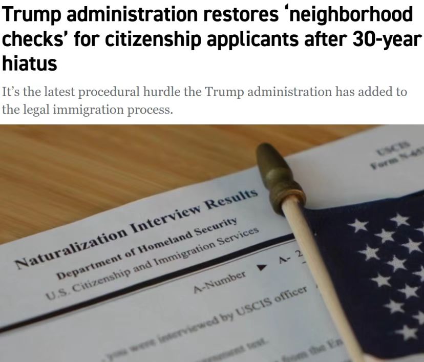 近日,特朗普政府表示,将重启已中断30年的“邻里调查”程序,即对申请入籍的美国移民展开走访式背景调查(可能包括采访入籍申请人的邻居或同事)。此举标志着政府将加大力度严格审查移民申请材料。