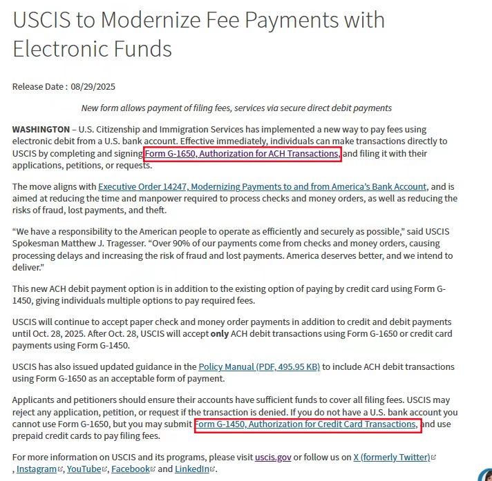 即日起,申请人可通过美国银行账户直接扣款(ACH)完成缴费,但10月28日后,将全面取消纸质(如支票等)支付。