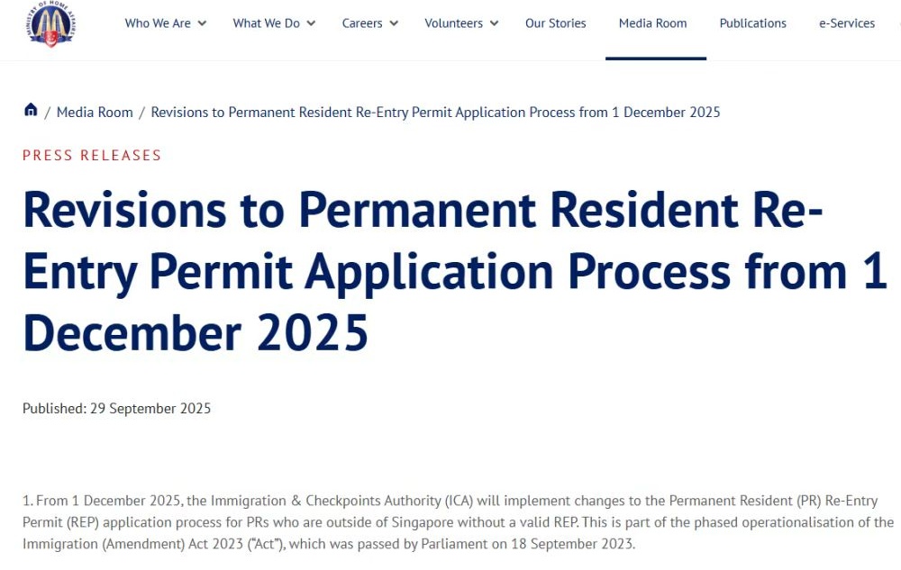 该证件保障了新加坡居民身份与居留权益的连续性,更是永久居民在海外旅居后,能够顺利回归的基础。不过目前,这一根本性保障制度即将迎来重要调整!前段时间,新加坡内政部(MHA)公布,《2023年移民修正法令》分阶段实施的关键条款将于2025年12月1日正式生效,而新加坡永久居民再入境许可证申请规则也将迎来变化。本文侨联君将为大家带来最新政策解析,大家不妨往下了解看看哟......