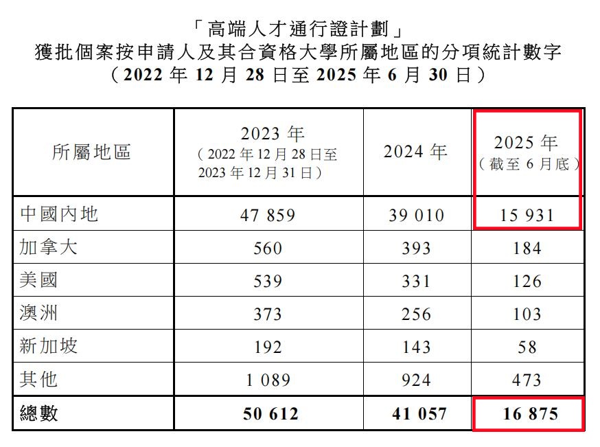 据香港入境事务处数据,今年截至6月30日,香港高才通共获批了16875宗,其中源自中国内地的申请人有15931宗,约占94%。