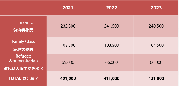 2020年10月30日,加拿大移民部部长Marco Mendicino宣布了《2021年-2023年移民水平计划》,在未来3年中,加拿大每年计划接收超过40万新移民,其中,2021年计划接收40.1万新移民,2022年升至41.1万,2023年再提升至42.1万。这样总移民数量将达123.3万!这个计划是加拿大有史以来吸纳移民数字最高的移民计划,或将开创加拿大移民历史新记录!