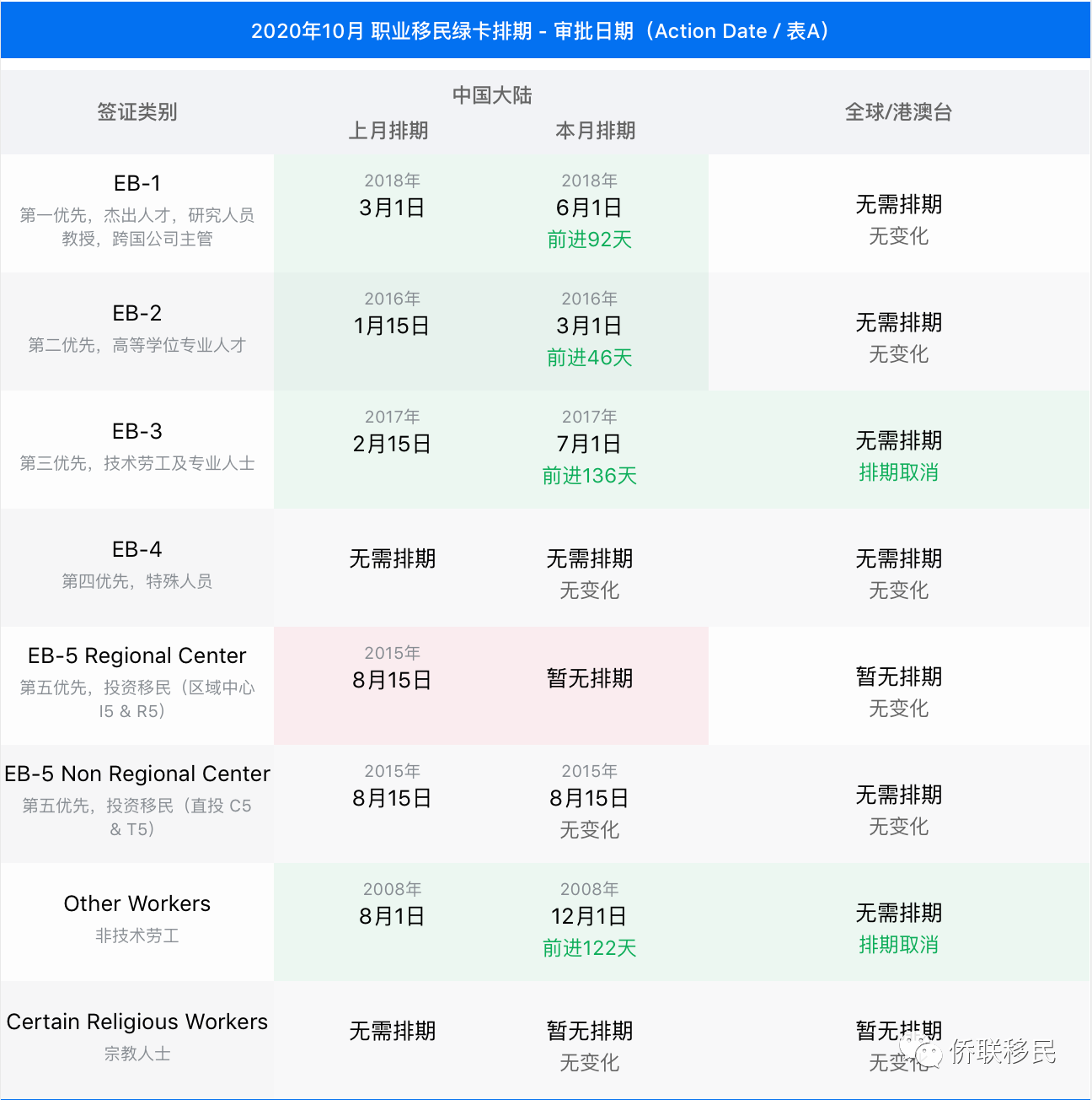 美国时间9月24日,美国国务院公布了最新2020年10月的移民排期表,最显著而影响深远的进展如下: