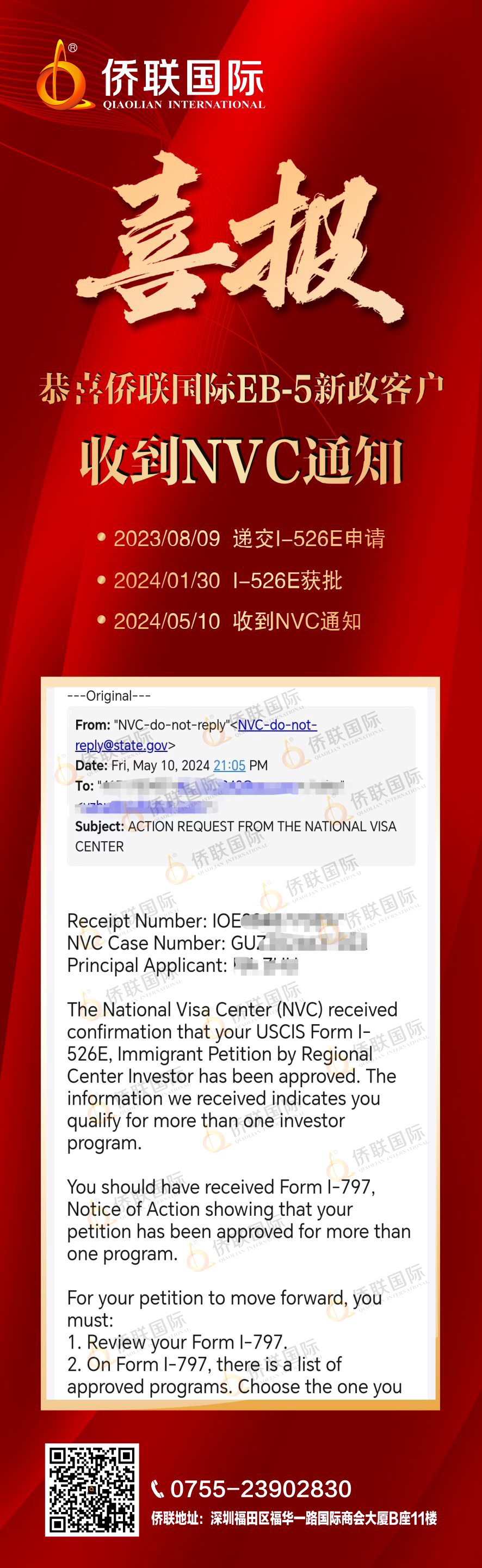 恭喜侨联国际EB-5新政客户收到NVC通知!
