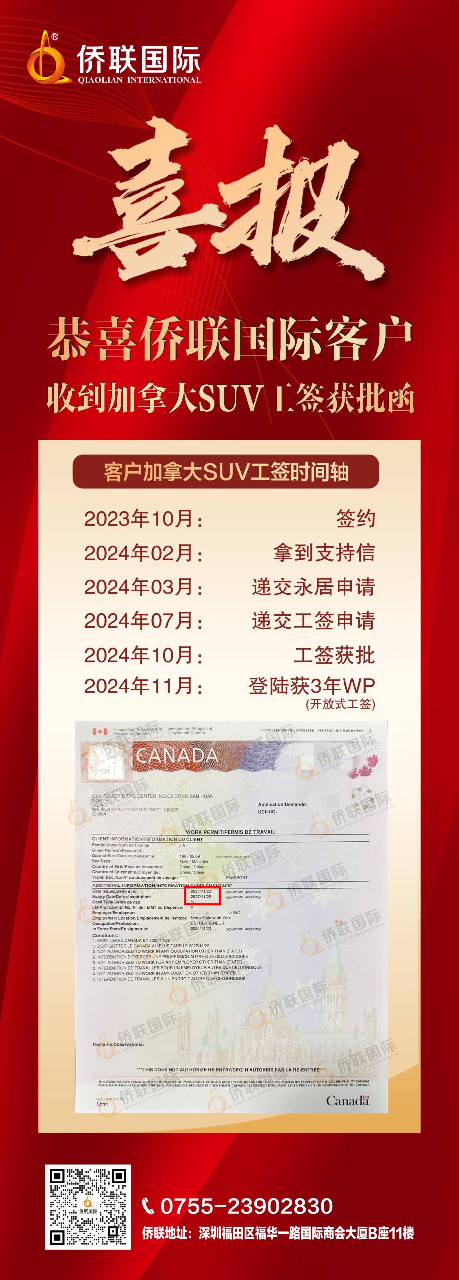 恭喜侨联国际客户加拿大SUV工签获批!