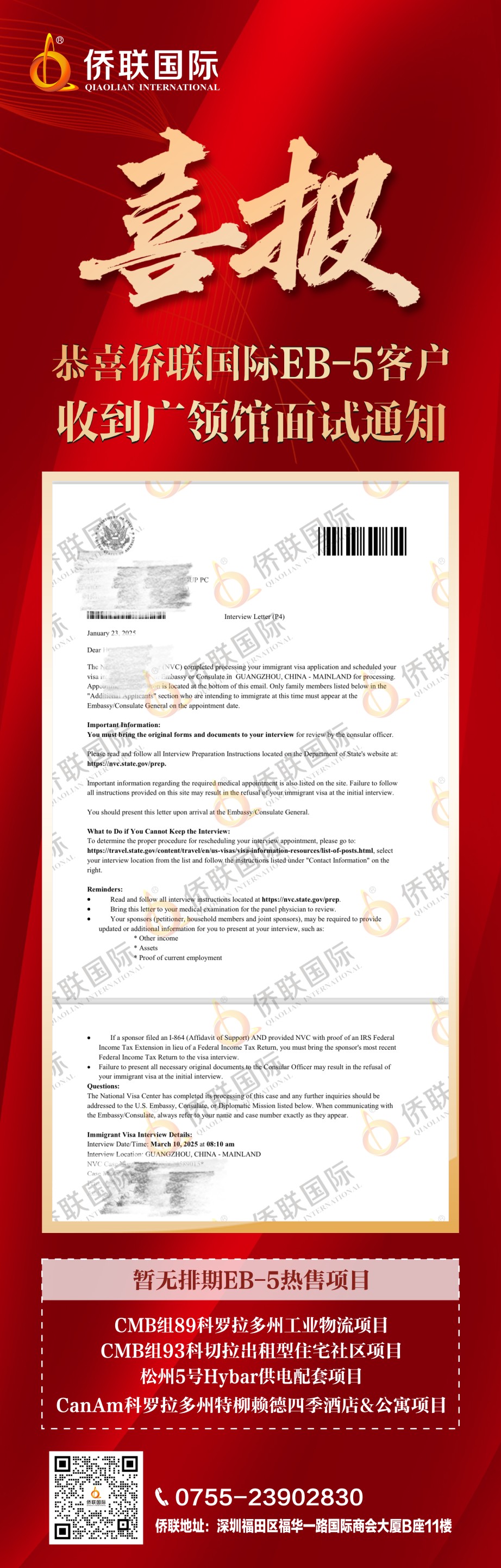 恭喜侨联国际EB-5客户收到广领馆面试通知!