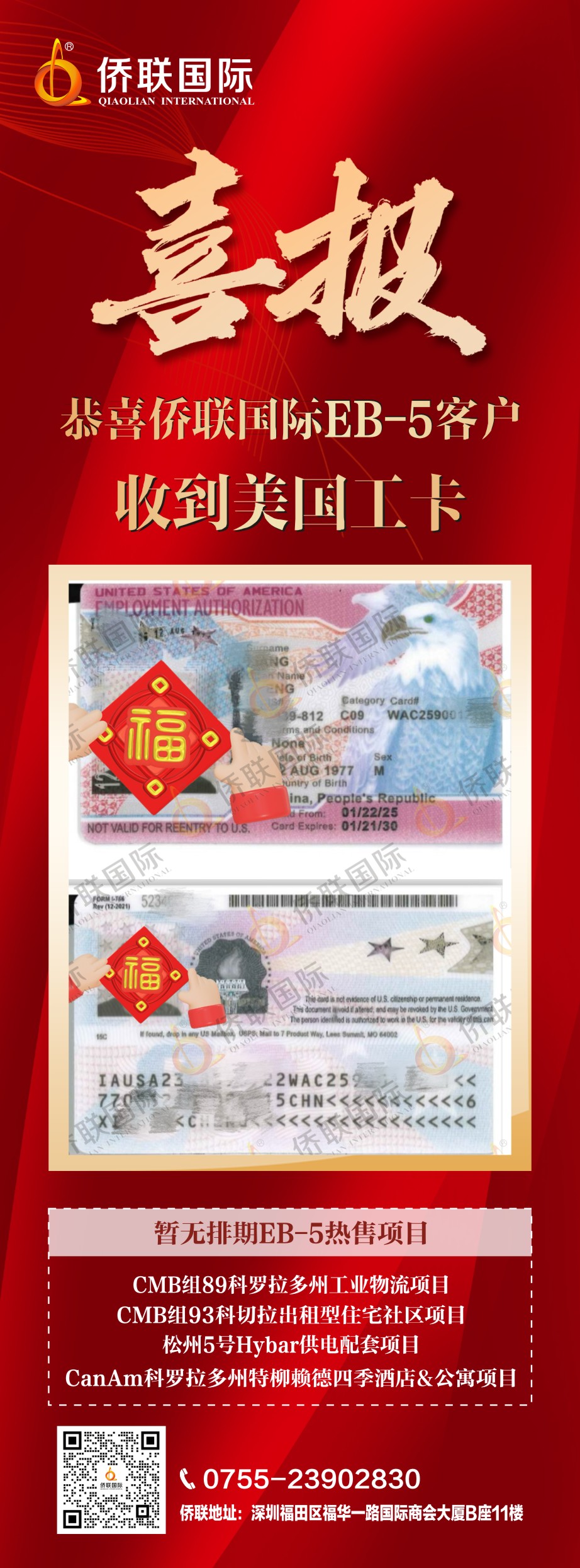恭喜侨联国际EB-5新政客户收到美国工卡!