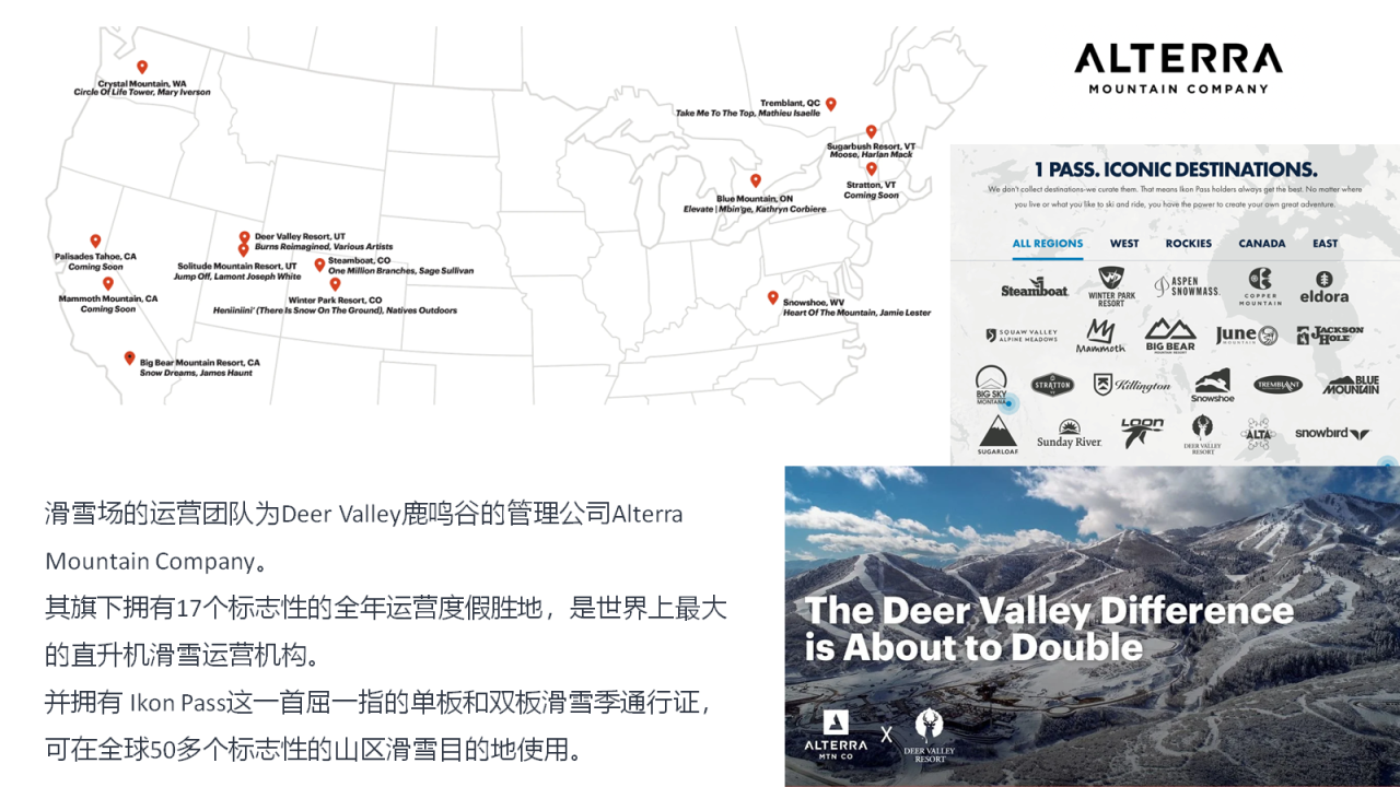 该公司总部位于科罗拉多州丹佛市,诞生于此地对山脉和冒险的共同热爱,公司汇聚了世界上最令人向往的一些品牌,包括科罗拉多州的蒸汽船度假村和温特帕克村(Steamboat and Winter Park in Colorado)、加利福尼亚州的太浩湖斯阔谷滑雪渡假胜地、猛犸山、六月山、大熊山度假村和雪谷(Palisades Tahoe, Mammoth Mountain, June Mountain, Big Bear Mountain Resort and Snow Valley in California)、佛蒙特州斯垂顿山和枫林度假村(Stratton Mountain and Sugarbush Resort in Vermont)、西弗吉尼亚州的雪鞋山(Snowshoe Mountain in West Virginia)、加拿大魁北克省的汤卜朗滑雪胜地和安大略省的蓝山滑雪胜地(Tremblant in Quebec and Blue Mountain in Ontario,Canada)、华盛顿的水晶山(Crystal Mountain in Washington)、爱达荷州的施韦策(Schweitzer in Idaho)、犹他州的鹿鸣谷度假村和孤独山度假胜地(Deer Valley Resort and Solitude Mountain Resort in Utah),以及BC省的CMH直升机滑雪胜地和夏季探险乐园(CMH Heli-Skiing & Sumrimer Adventures in British Columbia)。