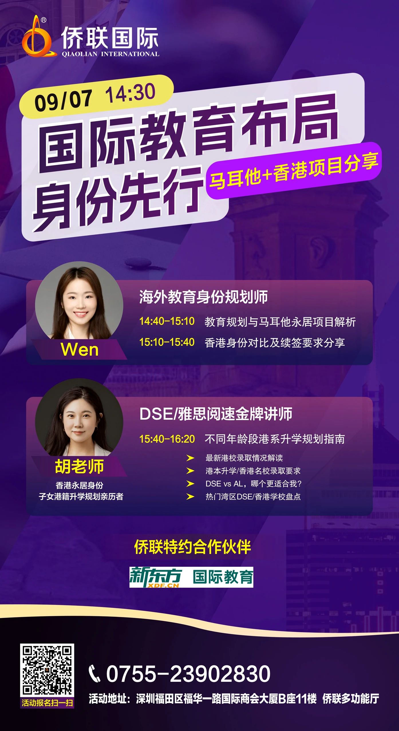9月7日(周六)下午14点,侨联国际特邀国际教育及海外身份规划专家为投资人现场权威解读马耳他&香港身份对比及教育规划优势,精彩内容详见下图,欢迎扫描下图二维码预约报名!
