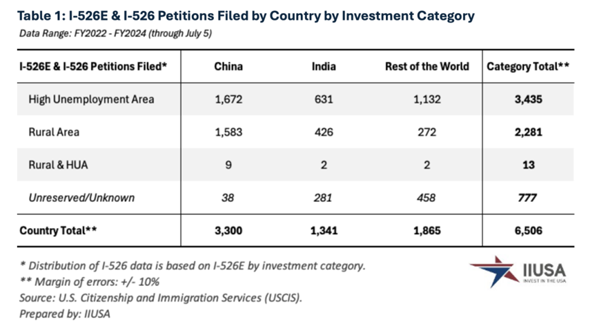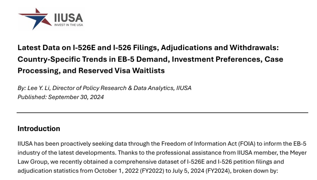近日,美国投资移民行业协会(IIUSA)依据公开信息发布了一份EB-5新政数据报告,该报告包含从美国2022财年至2024年7月5日的EB-5递交及获批情况:全球递交了6,506份申请。综合来看,中国整体的I-526E获批率高达94%。