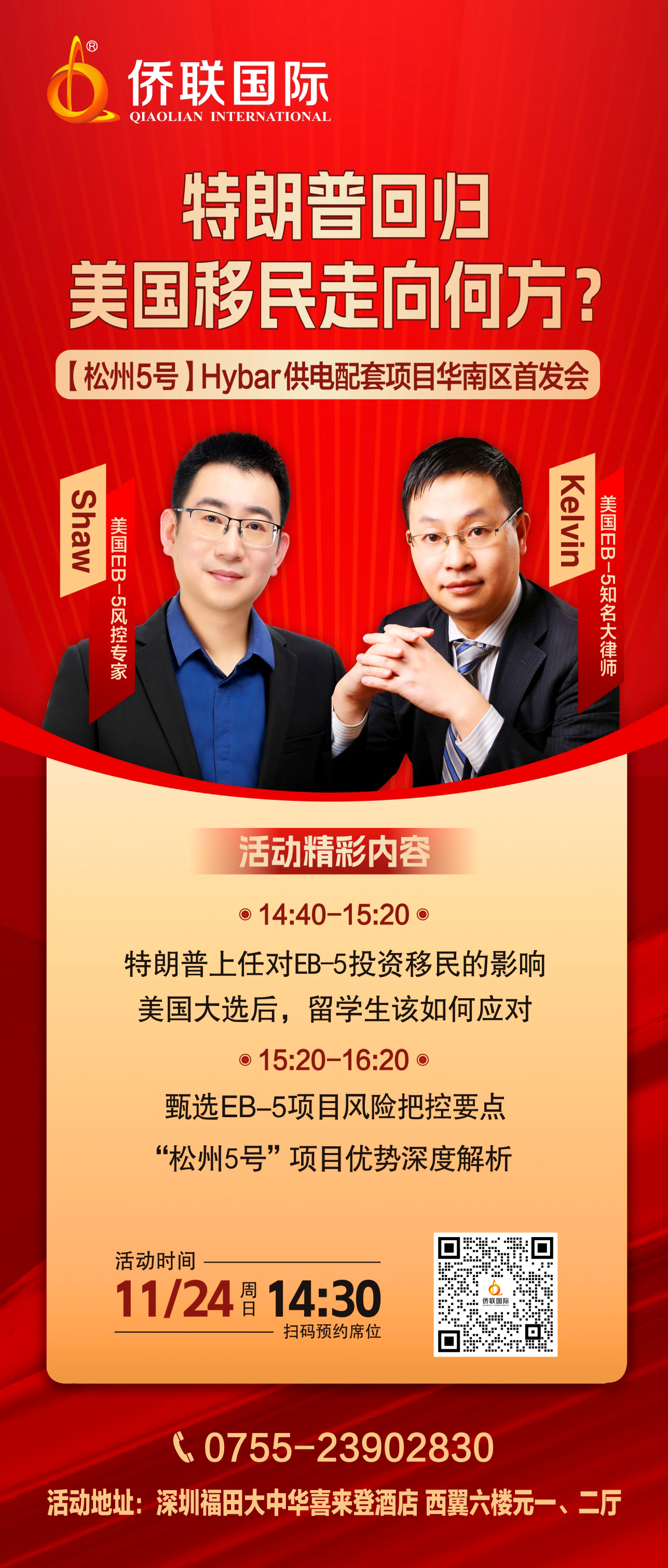 11月24日(本周日)下午14时,在深圳福田区大中华喜来登酒店六楼西翼元1、2厅,侨联国际将携手美国EB-5权威律师及松州区域中心专家为大家现场解读“特朗普回归,美国移民走向及“松州5号”项目独特优势”,欢迎有兴趣的朋友扫描下图二维码预约报名!
