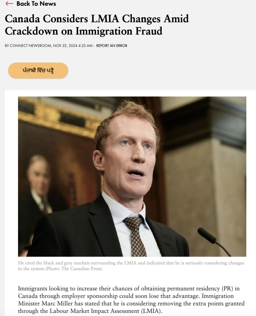 其次,加拿大时间11月22日,加拿大移民部长表示正在考虑取消雇主担保LMIA的加分,主要原因是很多人滥用加拿大雇主担保LMIA工签加分通过买卖工作offer进行移民欺诈。加拿大LMIA系统最初旨在确保加拿大雇主仅在加拿大人无法从事这项工作时雇用外国工人,然而该系统已成为欺诈的目标,肆无忌惮的雇主和招聘人员通过以高昂的价格出售虚假的工作机会牟利,这种非法活动破坏了LMIA计划的完整性,并给合法工人和雇主带来了挑战。