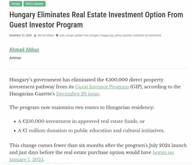 更令人意外的是,12月23日,匈牙利50万欧购房移民政策还没开始就宣布“关停”!匈牙利投资移民项目重启后,如今仅剩25万欧基金投资和100万欧捐款通道。