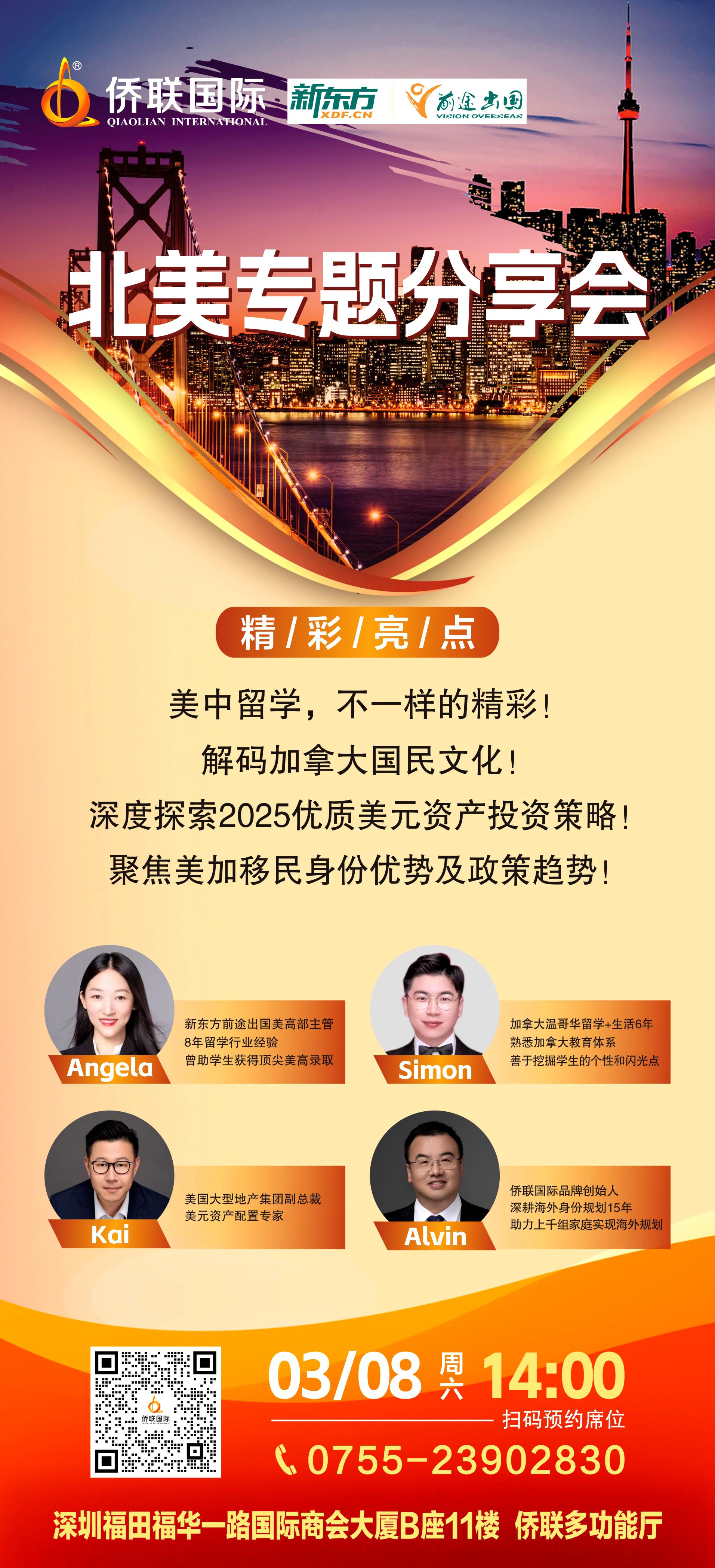 加拿大:基本移民类别分为:家属类移民、经济类移民以及难民人道主义移民。其中,经济类移民主要分为:联邦移民和省提名。值得注意的是都需要提供英语成绩。总的来说,加拿大对高技能人才需求较大,移民政策相对于美国人才类移民对于学历、工作经历的要求会低很多。目前,对于国内人士比较稳定优质的项目是SUV联邦创新企业家移民项目。美国与加拿大成为移民留学的热门之选,各有千秋。教育资源上,美国高校的全球影响力有目共睹。就业机遇层面,美国作为全球经济的 “巨无霸”,产业布局呈现出多元化的繁荣景象。而社会福利方面,加拿大则以全民医保制度闻名遐迩。移民留学的选择不只是看哪个国家更具吸引力,更要根据自身的需求来做决策。3月8日(本周六)下午14时,在深圳福田区福华一路国际商会大厦B座11楼 侨联国际多功能厅,侨联国际邀请到海外身份规划专家、新东方教育专家、资产配置专家为大家带来“北美专题分享”讲座活动,深入解答美加经济、教育、投资以及移民政策等全方位问题,欢迎有兴趣的朋友扫描下图二维码预约报名!