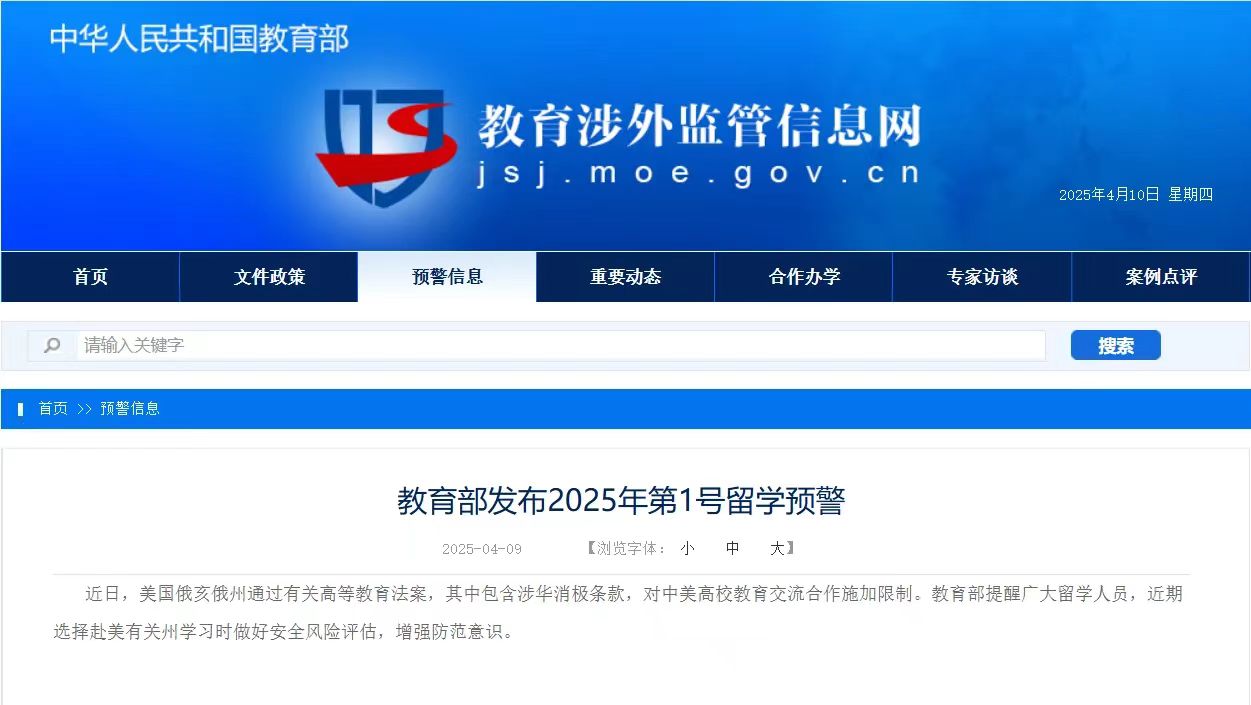 就在昨晚,教育部发布了2025年第1号留学预警!