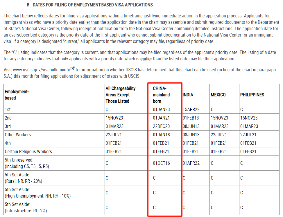 注:职业移民表B是递件排期,仅适用于在美国境内调整身份的申请人。若申请人不在美国,则适用领馆处理,可参考表A。