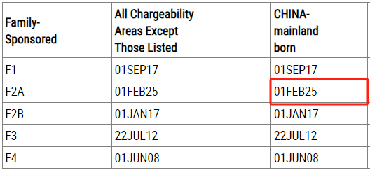 根据亲属移民排期表A,对于中国大陆出生的申请人来说: