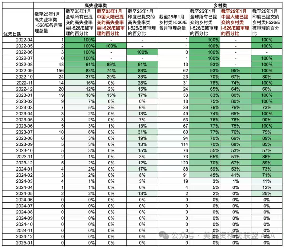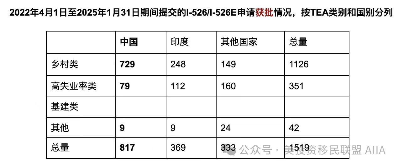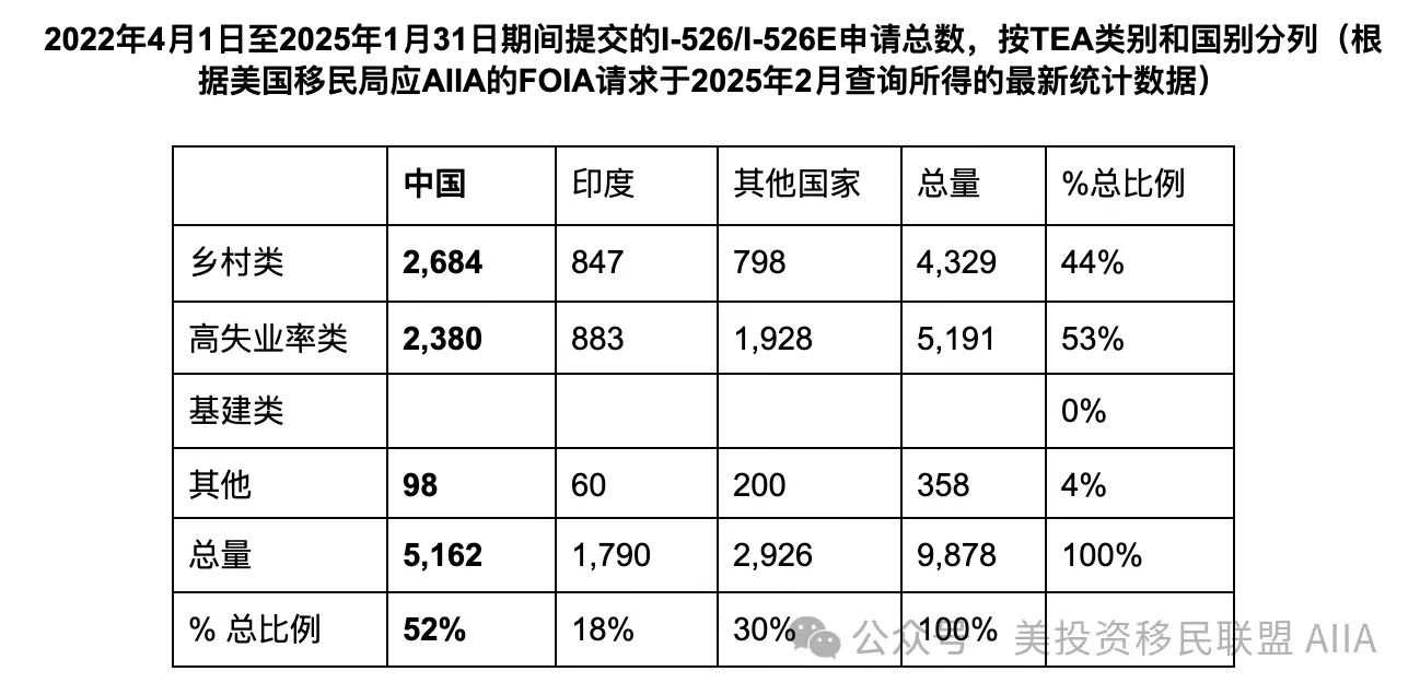 重磅消息,近来AIIA (由印度申请人主导的“美国投资移民联盟”) 正式公布了EB-5移民申请I-526E审理的最新详细数据。(注:该数据全部来自于美国移民局,是AIIA通过FOIA (“信息自由法案”)的权利向移民局申请披露获得的。)下面,我们一起来看看2022年4月初至2025年1月底期间所提交的I-526/I-526E申请总数,以及乡村类项目&高失业率项目同批申请的获批情况叭~