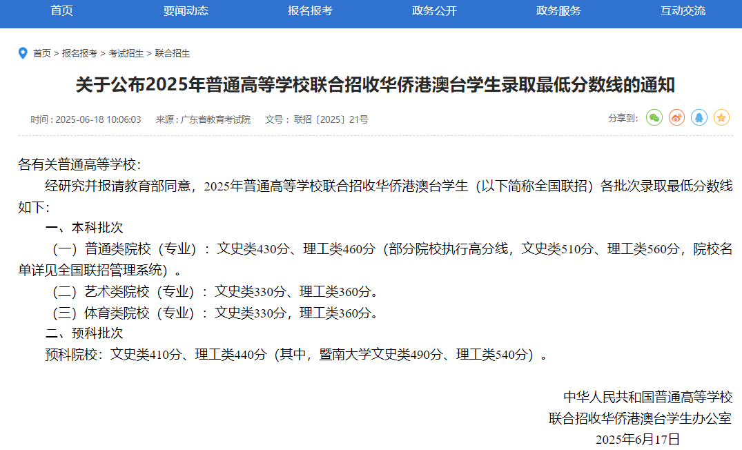 在万众期待中,6月18日上午,2025年华侨生联考最低分数线出炉啦!