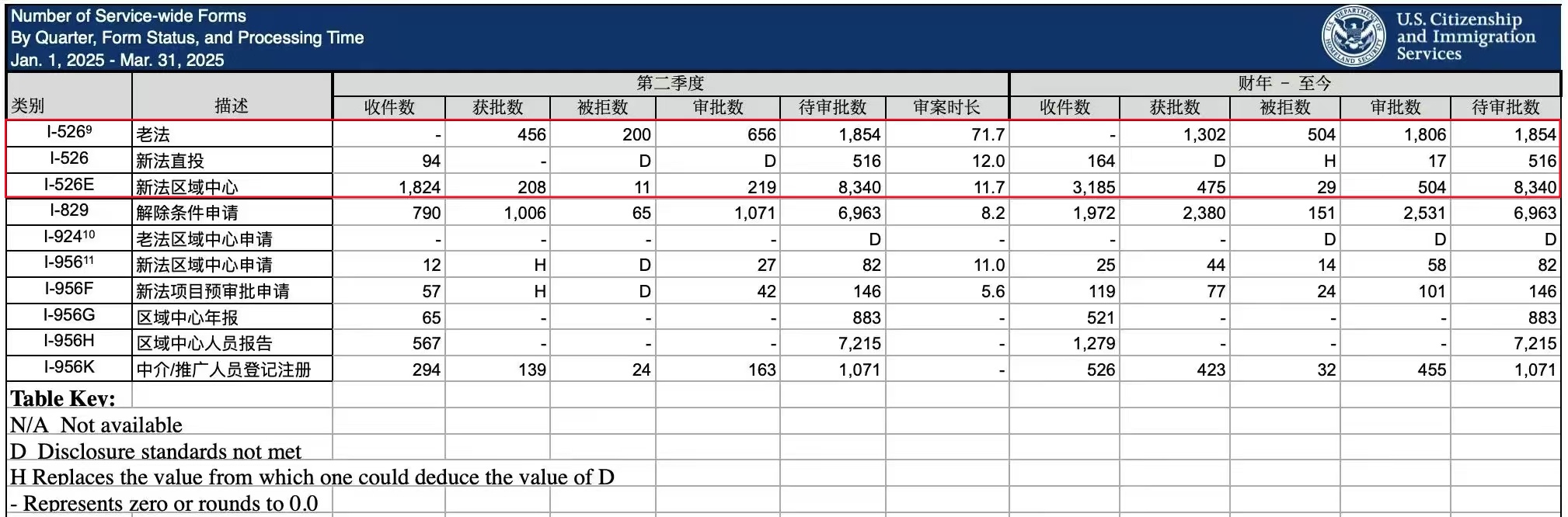 据悉,美国移民局在2025财年第二季度接收到的1918份EB-5新政申请里,区域中心项目(I-526E)就高达1824份,直投项目则仅94份。截止2025年3月31日,I-526E目前的待审案件已累计8340件。