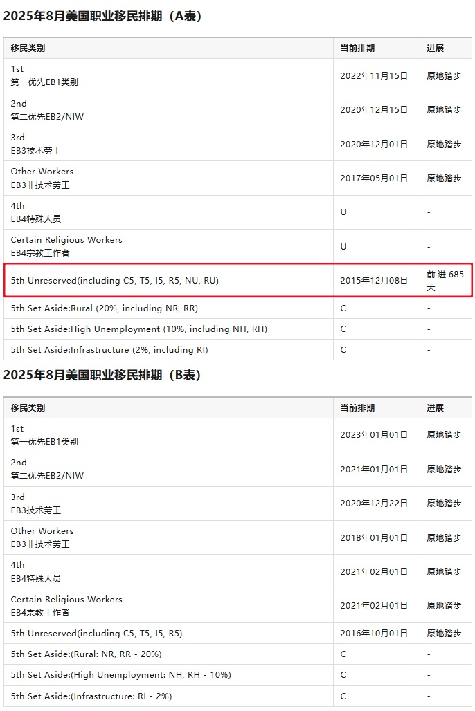 在此次新的排期表上,职业移民EB-5突现曙光,表A大幅前进了685天,EB-1、EB-2(NIW)、EB-3均无变化;亲属移民表A全线停滞,表B局部前进。