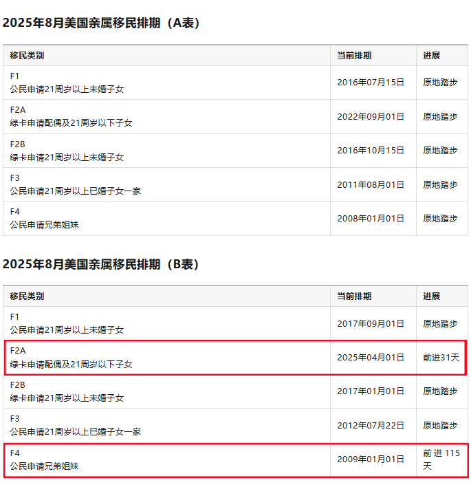 F2A(绿卡持有者的配偶和子女)表B前进了31天,当前排期2025年4月1日;