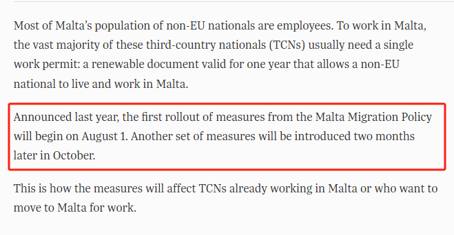 近日,马耳他政府正式官宣将从8月1日和10月1日起分阶段实施新的《马耳他移民政策》,此次调整涉及在马的第三国公民(TCN)将迎来一系列新规。