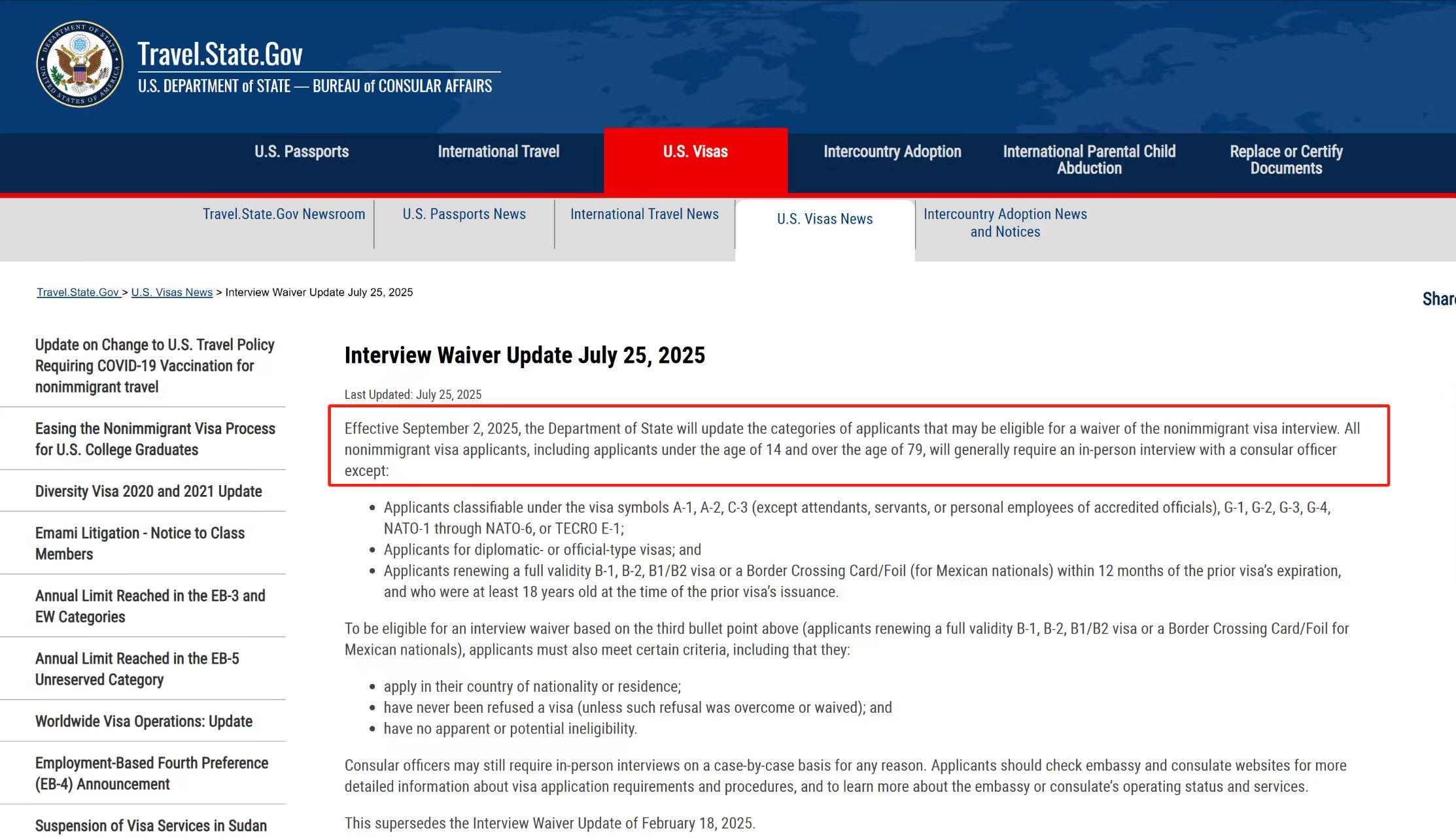 近日,美国国务院对于非移民类签证免面谈续签要求又做了更新,新政将于2025年9月2日正式实施。此次新规调整的最大变化是:取消14岁以下与79岁以上非移民签证申请人的面谈豁免资格。