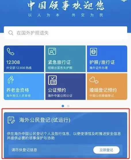 第一步:在手机应用商店搜索“中国领事”,下载官方APP(免费),打开后可在首页看到“海外公民登记(试运行)”一栏。