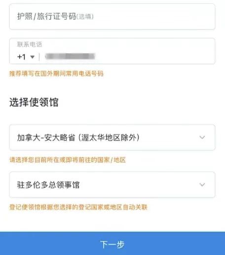第二步:填写个人信息,并选择相应的使馆。需注意的是,联系电话一栏建议填写在国外期间常用的电话号码。