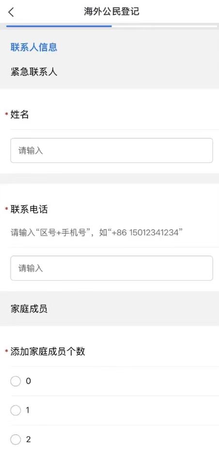 第四步:填写联系人信息,需填写紧急联系人的姓名和联系电话,并填写家庭成员信息。