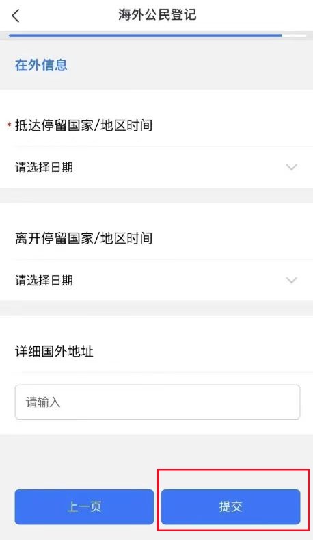 第五步:填写在外信息,包括抵达时间和离开时间。完成以上操作后,点提交,“海外公民登记”即完成了。