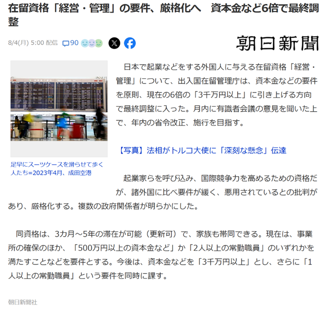 8月4日,据日本主流媒体《朝日新闻》报道,日本出入国在留管理厅正就外国人在日本创办企业所需的“经营·管理”在留资格进行调整,计划将大幅提高申请门槛。