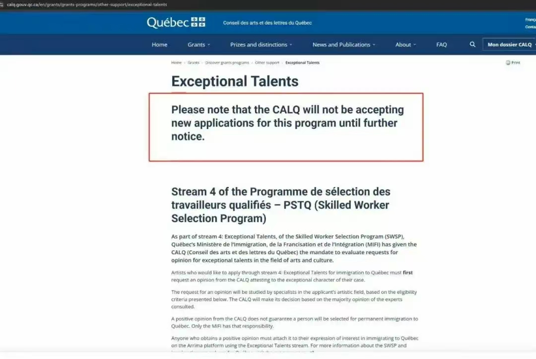 8月5日,加拿大魁北克省艺术与与文学委员会(CALQ)重磅官宣,即日起,暂停接受“杰出人才移民计划”中Stream 4(艺术类通道)的新申请,重启时间待定!