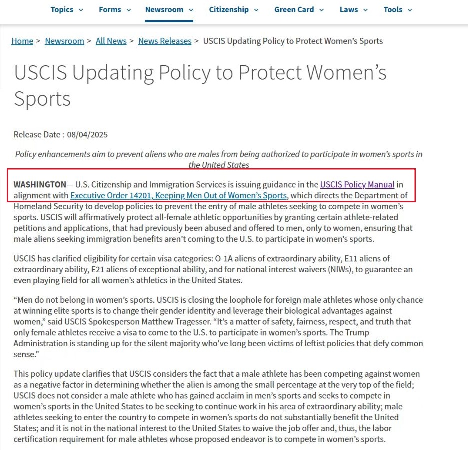 此外,公告还表示,USCIS“将积极保护所有女性的运动机会,并将之前被滥用,同时提供给男性的某些与运动员相关的申请只提供给女性,确保需求移民福利的外国男性不能前往美国参加女性运动。”