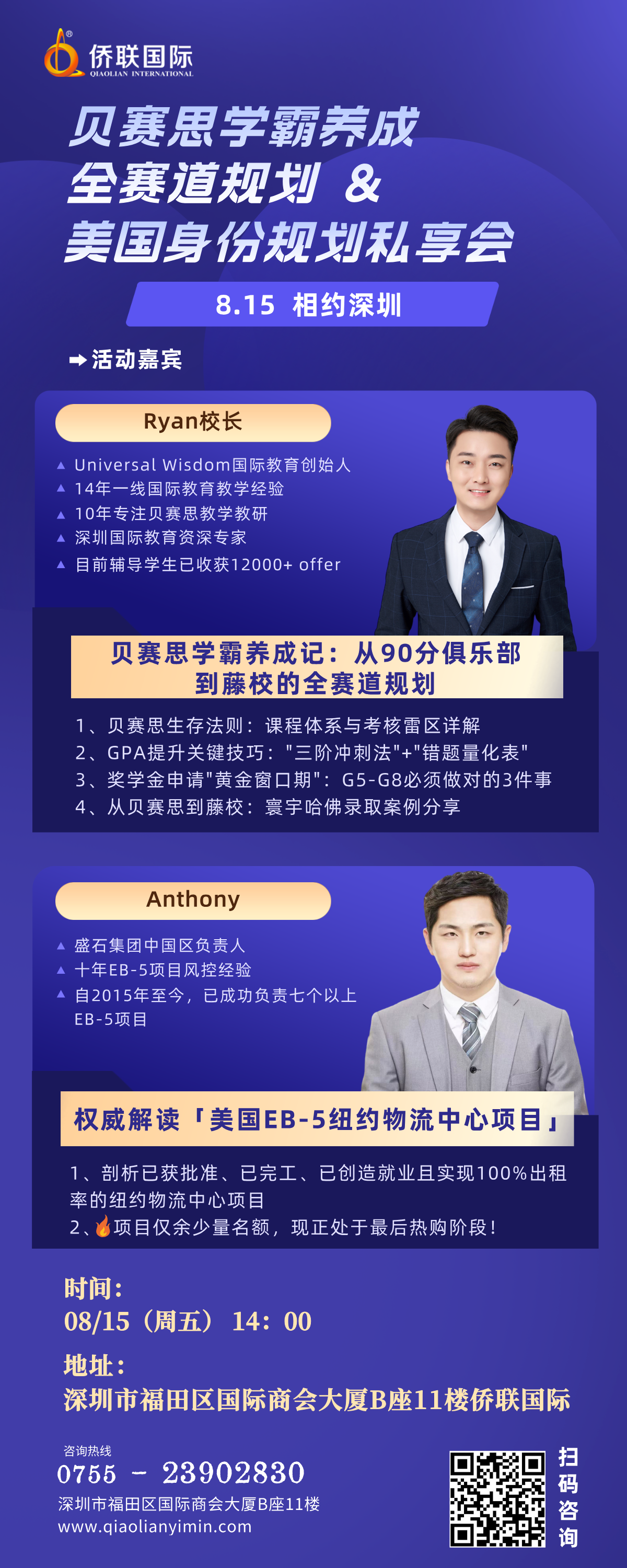 8月15日(周五)下午14:00,侨联国际特邀Universal Wisdom创始人Ryan校长,以及盛石集团中国区负责人Anthony,将为大家现场解析贝赛思学霸养成全赛道规划,同时权威解读美国EB-5纽约物流中心项目。