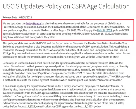 ④ 计划近期递交I-485用表B锁龄的家庭 8月15日前是最后窗口期,如果表B处于开放状态,那么建议尽快递交I-485以锁定表B政策。 总结:此次CSPA政策的更新,再次表明美国移民局正在收紧政策或缩小申请人可操作的时间窗口。对于已递交I-485申请的申请人来说可以松一口气,但对于临近超龄的子女来说,恐怕准备好体检报告,也不一定来得及了。 若您对于CSPA年龄计算、排期,或者自身情况是否受影响存有疑问,欢迎随时私信侨联君,我们会根据您的具体情况给予合适的方案。