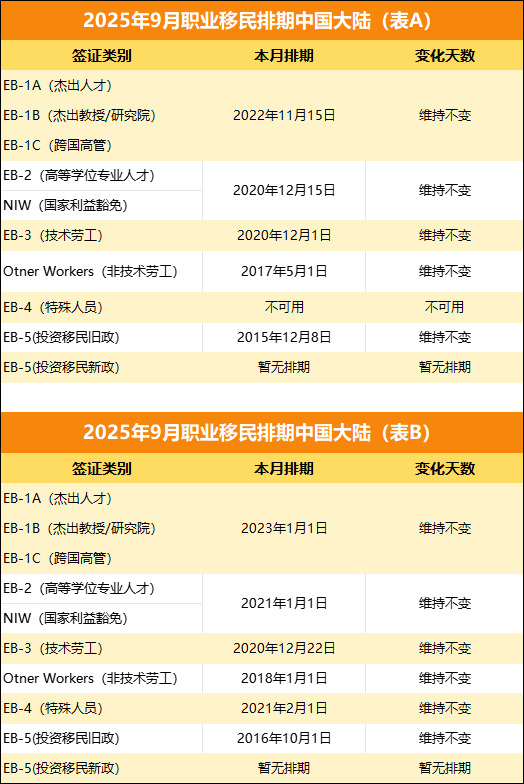 总结:需注意的是,9月职业移民类别(涵盖EB-1、EB-2、EB-3、EB-5类别)依然无法使用表B排期,仅有亲属移民类别的表B可使用。