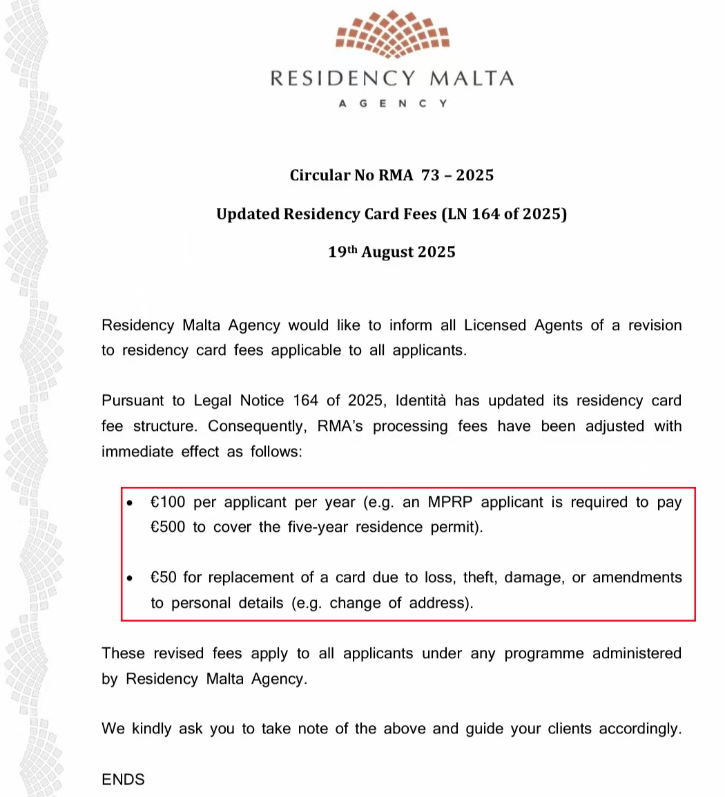 当地时间8月19日,马耳他居留局发布了最新通告,根据2025年第164号法律公告(LN 164 of 2025)的规定,马耳他身份与护照局更新了居留卡的收费标准。