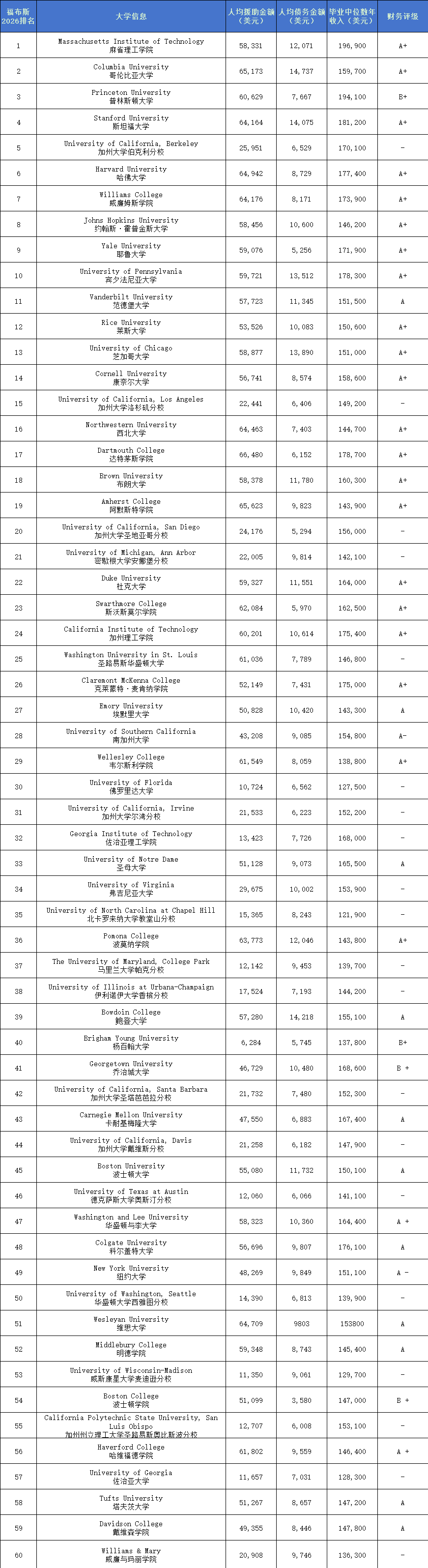 从以上评估标准来看,换句话说便是,若一所学校的学生能够在大一顺利续读、如期毕业、毕业后能斩获高薪工作,同时不用背负沉重的贷款包袱,那么这所大学自然会在榜单中崭露头角。