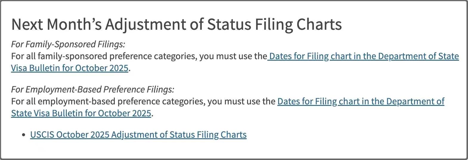 表B(可递交但尚无可用签证的截止优先日):仅代表“可以递交申请”的节点。当表B开放时,符合条件的申请人无需等到表A排期,即可提前递交身份调整申请(I-485)及相关材料。