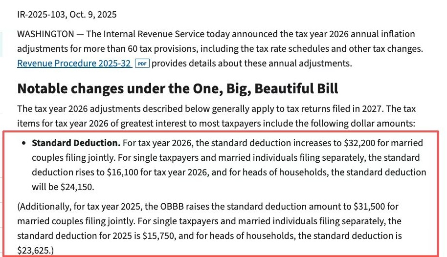 而以上标准扣除额的调整提升,实则也是在“大而美法案”的基础上作了进一步优化。不过对于大多数纳税人来说,扣除额的提升,相应的将会降低2026年度的应纳税额,可谓是一大利好。