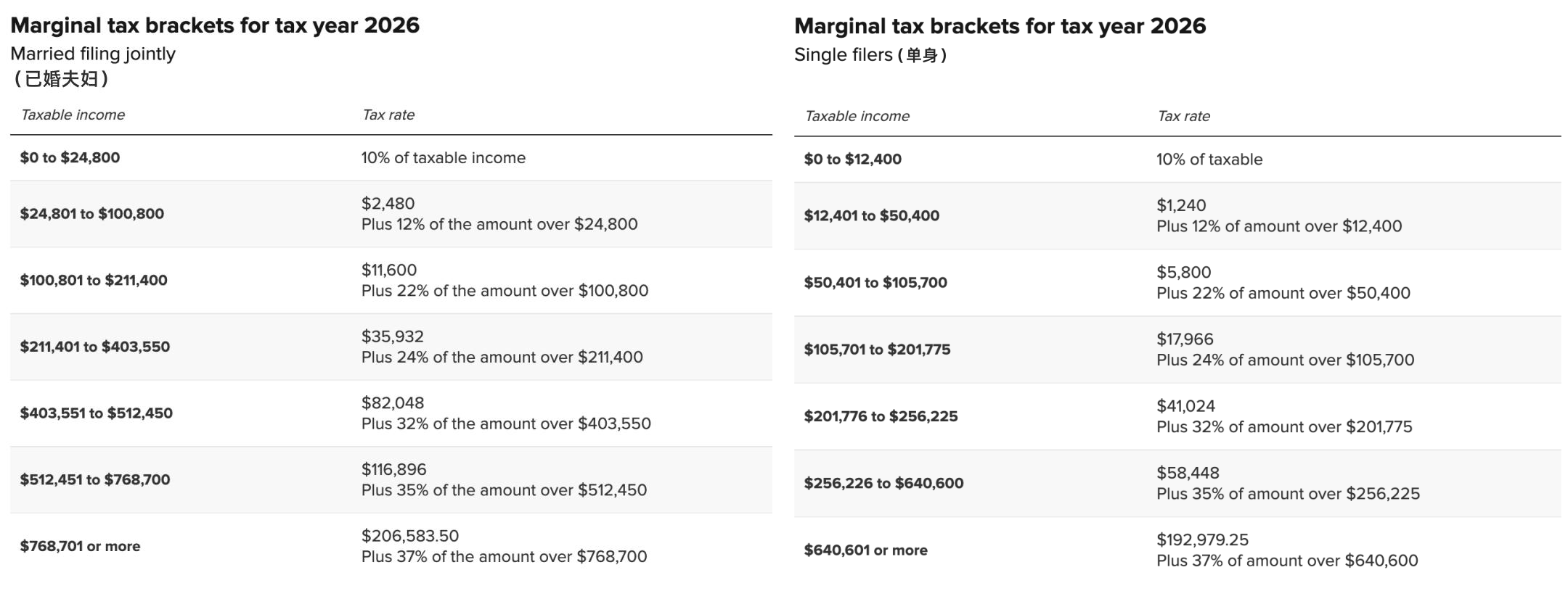 美国的个人所得税系统采用的是渐进税率结构,同时维持7个税级(10%、12%、22%、24%、32%、35%、37%)不变,不过后续每个税级的收入范围都将有所上调。此前,37%的税率仍将保留,不过对应的门槛却有所提高。自2026年起,单身纳税人年收入超过640,600美元、夫妻联合申报收入超过768,700美元时,都将适用于最高税率。