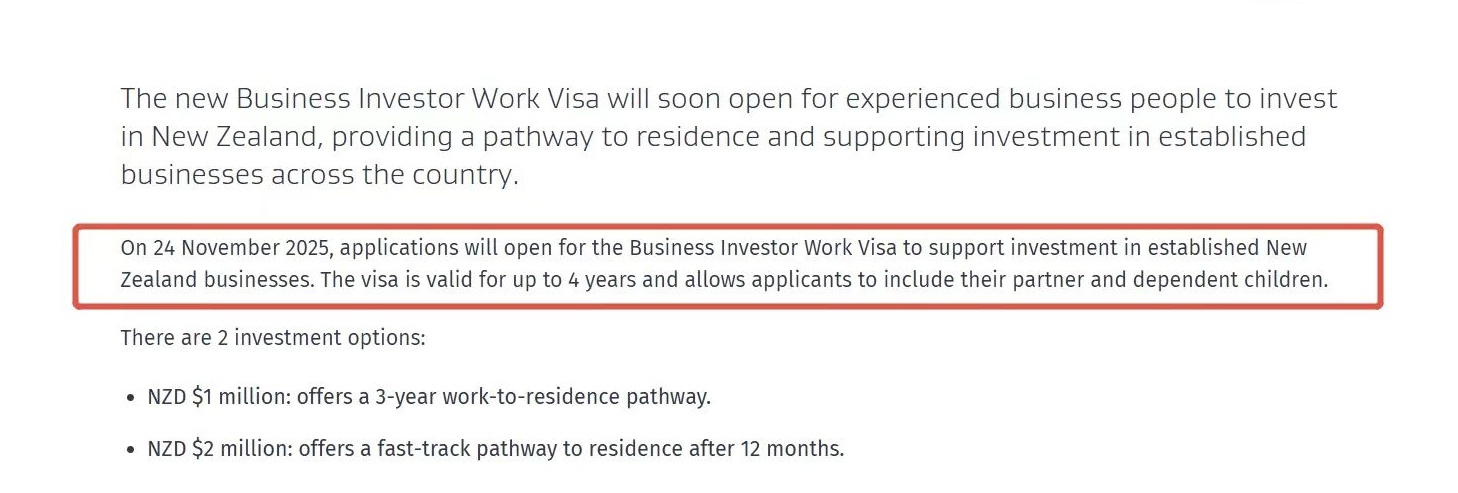 重磅消息,2025年10月20日,新西兰移民局正式发布了全新的商业投资者签证(以下简称:BIV)详细细则,同时并宣布该签证将于2025年11月24日开放申请!该签证类别旨在吸纳具备商业背景的投资者,通过投资新西兰的现有企业,从而为其开启一条获得居留资格的通道。接下来,侨联君就来为大家解析此次新政都有哪些具体要求及细则,从而助力大家理清思路,高效规划~