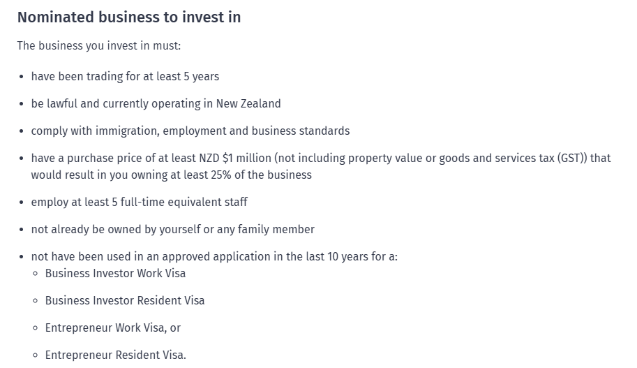 购买价至少100万纽币(不含房产价值和GST),并且申请人须持有企业25%以上的股份;在过去10年内,没有在以下任何批准的申请中使用过(商业投资者工作签证、商业投资者居民签证、企业家工作签证或企业家居民签证)。