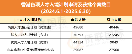 根据劳工及福利局局长孙玉菡近期公布的数据,截至今年6月底,香港高才通已收到13.5万宗申请,其中10.9万宗成功获批,内地人才占比高达94%,成绩斐然。短短一年间(自2024年6月1日至2025年6月30日),香港各项人才计划中申请人数与获批人数最多的当属高才通计划,其中申请人数达49680宗,获批人数达40466宗,获批率达81.41%。