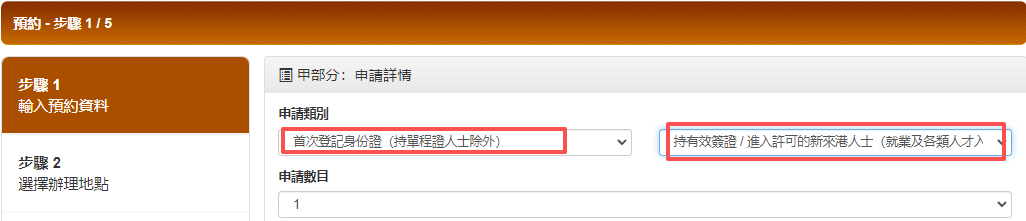 甲部分:一般选择“首次登记身份证”和“持有效签证/进入许可的新来港人士”