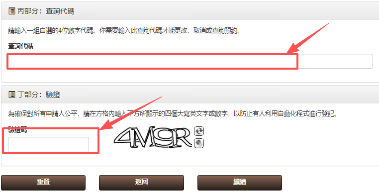 这部分申请人可自行设置一组4位数字代码。后续如若更改、取消、查询预约都需用到这四个数字,切勿忘记!最后输入旁边的验证码,点击继续即可。