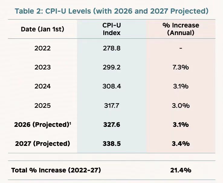 从2022年至2025年来看,这4年的CPI-U指数均有不同程度的上升。若加上后续2026年及2027年的CPI预估,其CPI的累计增长率约为21.4%(此处采用复利概念,非简单相加)。