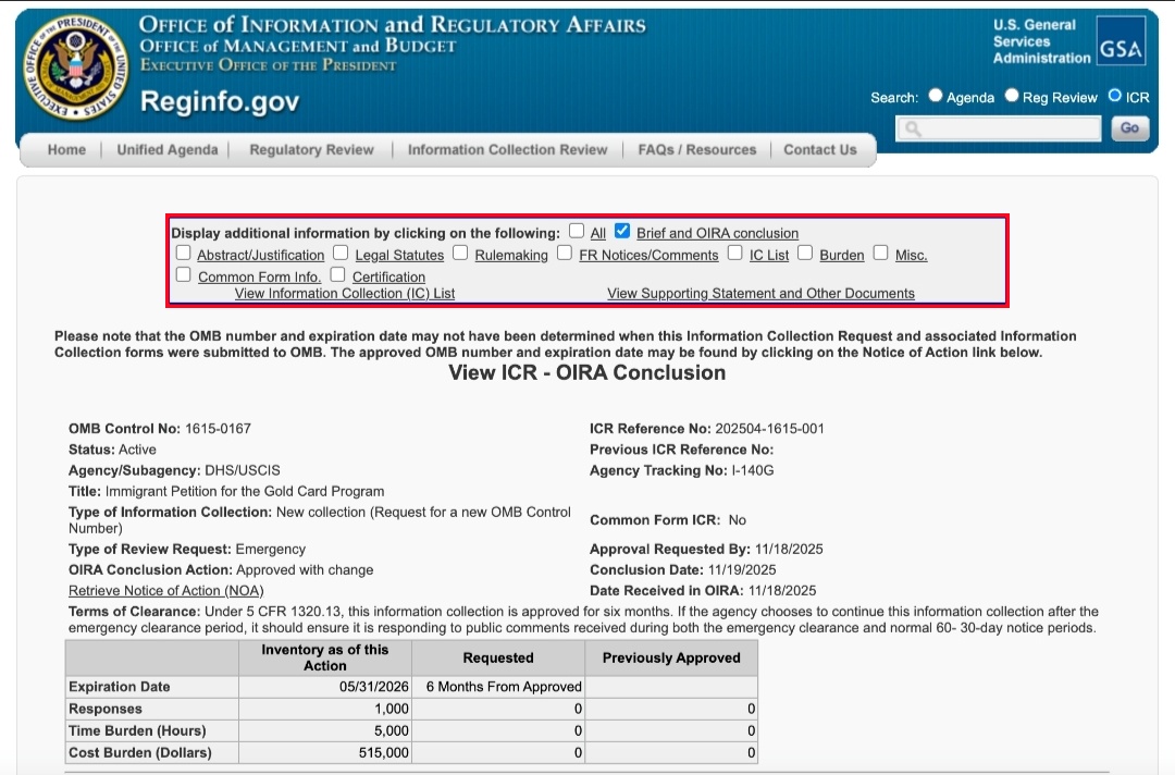 目前据最新动态显示,Gold Card的核心申请表I-140G,已于11月18日提交至白宫预算管理办公室(OMB)进行审核,并于次日获得加速获批。也就是说,Gold Card距90天的推出点仅剩一个月的时间。