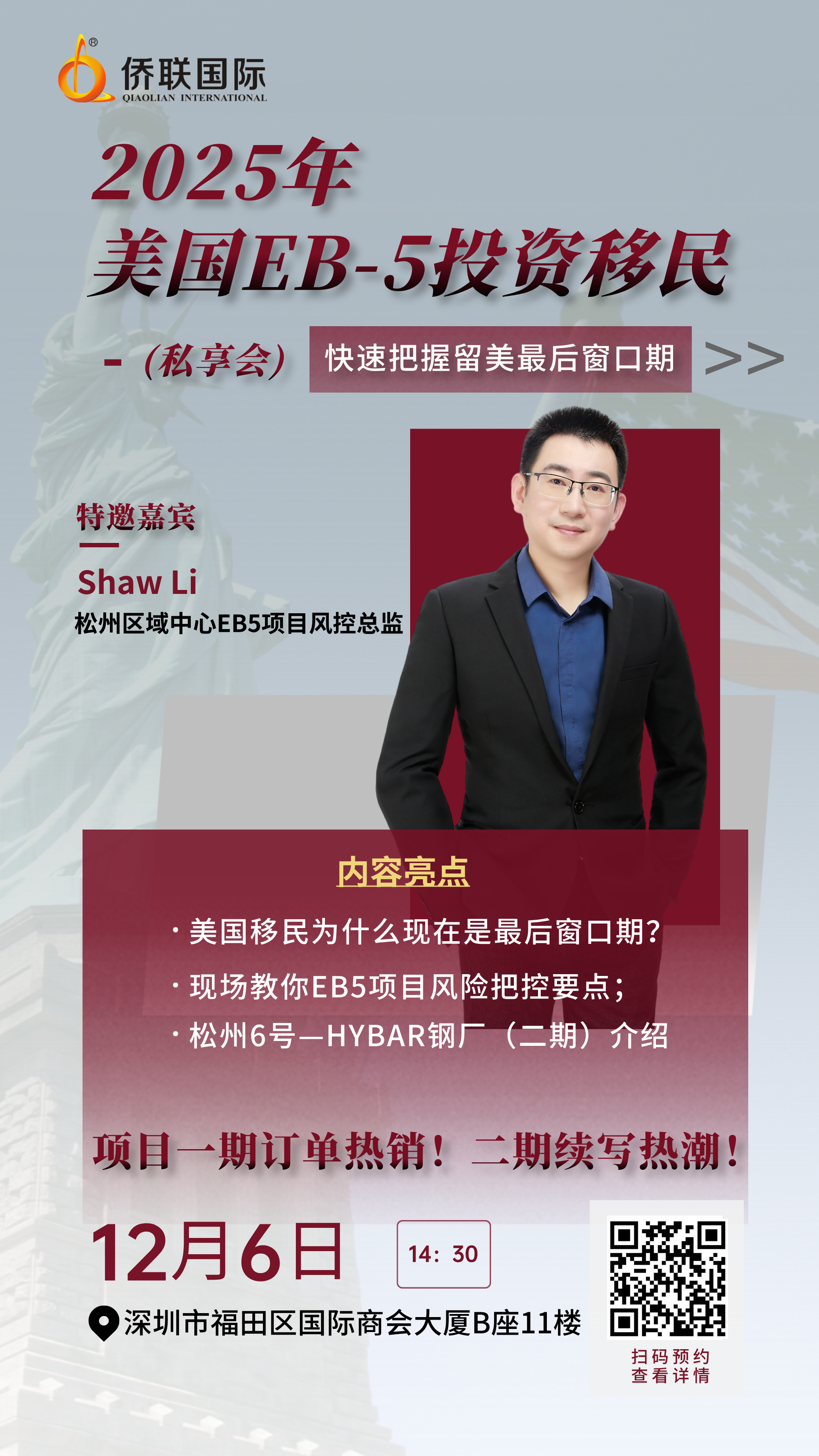 12月6日(周六)下午14:30,一场以「2025美国EB-5投资移民,快速把握留美最后窗口期」为主题的线下私享会,将于深圳·福田举行。 届时,侨联国际特邀松州区域中心EB-5风控总监Shaw Li,为大家带来快速移民美国的最新通道——HYBAR钢厂二期。 该项目将延续前作优势,且项目实力再次升级,开启重磅发售! 本场私享会,Shaw Li将聚焦于美国EB-5投资最新趋势解读、EB-5项目风险把控要点及海霸二期项目优势,为大家带来深度解析,以此为您的投资之路保驾护航。 为何要把握EB-5投资黄金窗口期? (EB-5“双9.30”大限压顶,把握“无排期”及“双递交”末班车。) 如何规避风险选对EB-5投资项目? (现场教您甄选EB-5项目风险把控要点,投资更安心。) HYBAR钢厂二期优势深度解析! (深度解析将建造项目规划、优势,以及历往优秀成果。) 值得重视的是,此高品质乡村EB-5项目,依然可享受乡村TEA地区的20%签证预留和优先审理政策。 HYBAR钢厂二期概况及优势 项目概况 总投资额:7.5亿美元 创造就业岗位:就业盈余高达4倍。 建筑周期:2年(2026年Q1-2028年Q3),其中建筑期为22个月,其余为钢厂试运营生产期。 项目优势 美国政府长期政策是有利于本土钢铁行业发展的,并且市场需求很大,如基建法案规定使用美国产钢铁。 州政府指定区域中心,拥有10年乡村EB-5项目经验。 高于USCIS要求的双重审计。 唯一美国本土养老基金投资项目。 2家资产超千亿集团公司钢厂直接股东。 HYBAR母公司为借款人。 钢厂前十年产量50%,已被钢厂股东Quanta Services和LMS钢筋集团订购。 ...... 名额有限, 机会不容错过! 立即私信侨联君抢占席位叭~ 让我们并肩开启美国身份通道,为孩子的留学征程扫清障碍,铺就坦途。